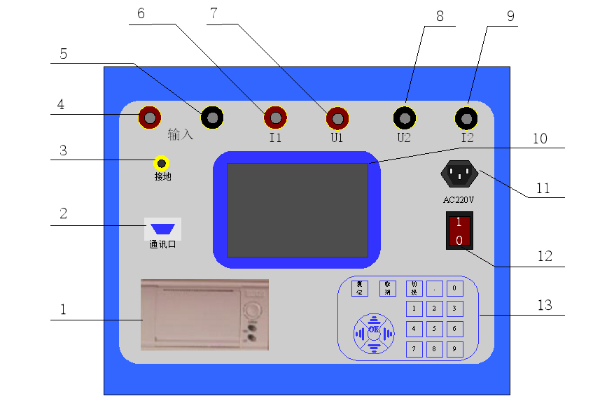 3)安全接地端鈕;                                                       4)5)測試回路的輸入端,接試驗調(diào)壓器的輸出端鈕。
