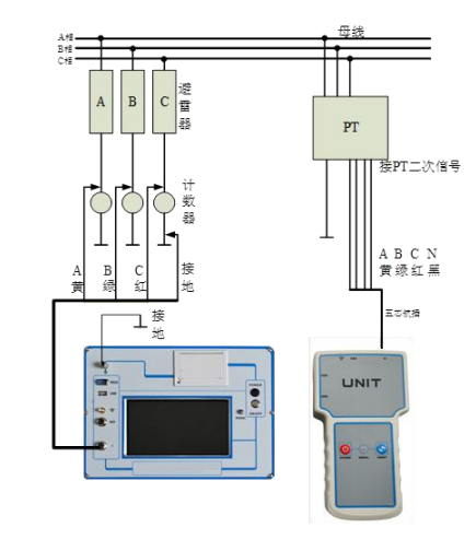 測試線接線方法如圖 3 所示,請先接主機電流線(航插 4 芯引出 4 根線),接入主機航插,再接黑線到計數器下端地線,然后分別按黃綠紅顏色線接入 A、B 、C 相避雷器下端計數器上端。再接單元的電壓線(航插 5 芯引出 4 根線),接入單元航插,再接 PT 二次測量端,分別按黃綠紅黑顏色線接入二次側測量端的 A、B、C、O,一定要小心謹慎接線以避免 PT 二次或試驗電壓短路。