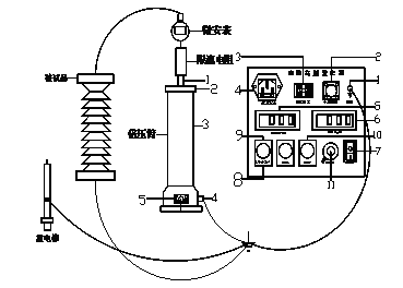 10.升壓至所需電壓或電流。升壓速度以每秒3—5kV試驗(yàn)電壓為宜。對(duì)于大電容試品升壓時(shí)還需監(jiān)視電流表充電電流不超過試驗(yàn)器的最大充電電流。對(duì)小電容試品如氧化鋅避雷器、磁吹避雷器等先升至所需電壓(電流)的95%,再緩慢仔細(xì)升至所需的電壓(電流)。然后從數(shù)顯表上讀出電壓(電流)值。如需對(duì)氧化鋅避雷器進(jìn)行0.75UDC—1mA測(cè)量時(shí),先升至UDC1mA電壓值,然后按下黃色按鈕,此時(shí)電壓即降至原來的75%,并保持此狀態(tài)。此時(shí)可讀取電流。測(cè)量完畢后,調(diào)壓電位器逆時(shí)針回到零,按下綠色按鈕。需再次升壓時(shí)按紅色按鈕即可。