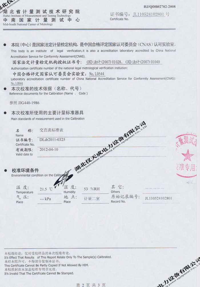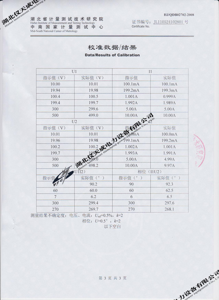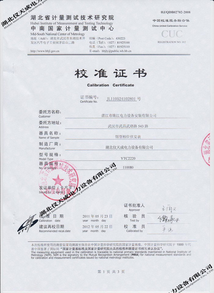 轉載:"YTC2220數字雙鉗相位伏安表的資質證書" 請注明來源于儀天成電力。 更多技術問題請致電儀天成電力客戶服務:027-87876585,技術部專線:027-87876585,在線客服:719388481