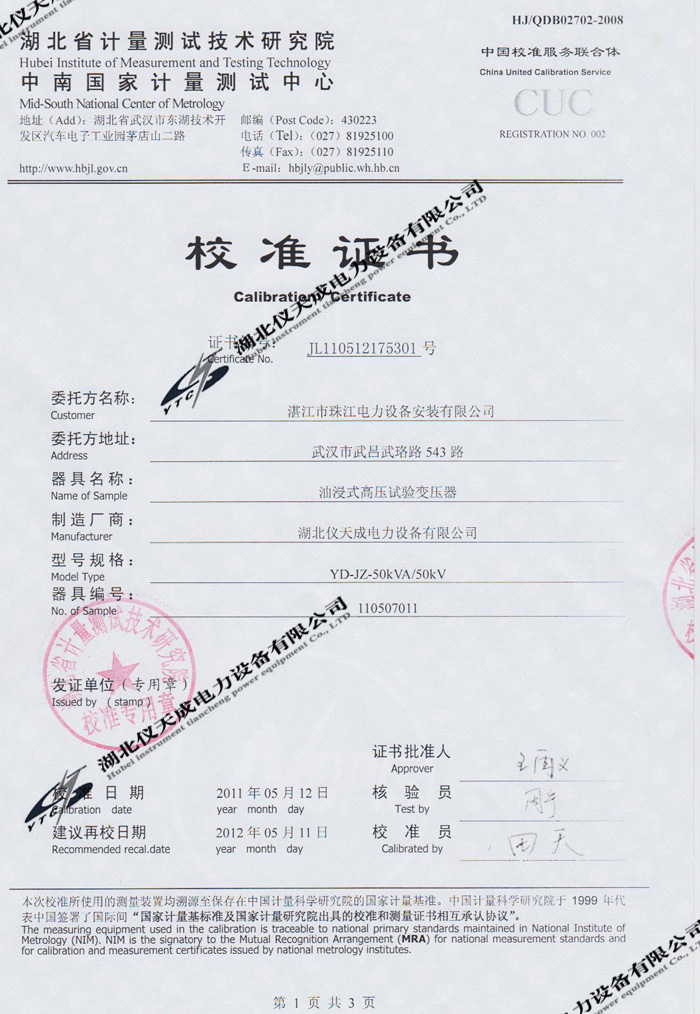 轉(zhuǎn)載:"YD-JZ-50kVA/50kV油浸式試驗(yàn)變壓器的資質(zhì)證書" 請(qǐng)注明來源于儀天成電力。 更多技術(shù)問題請(qǐng)致電儀天成電力客戶服務(wù):027-87876585,技術(shù)部專線:027-87876585,在線客服:719388481
