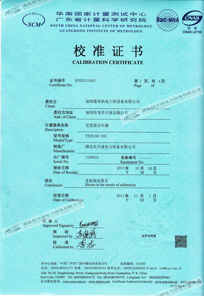 轉載:"YTC8106-200 交直流分壓器的資質證書" 請注明來源于儀天成電力。 更多技術問題請致電儀天成電力客戶服務:027-87876585,技術部專線:027-87876585,在線客服:719388481