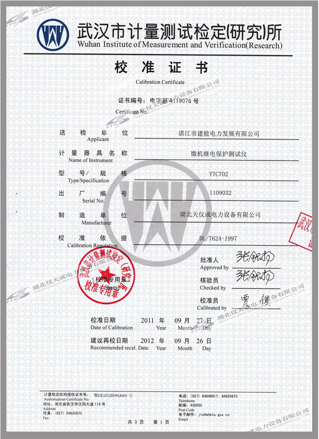 轉載:"YTC702微機繼電保護測試儀鑒定證書" 請注明來源于儀天成電力。 更多技術問題請致電儀天成電力客戶服務:027-87876585,技術部專線:027-87876585,在線客服:719388481